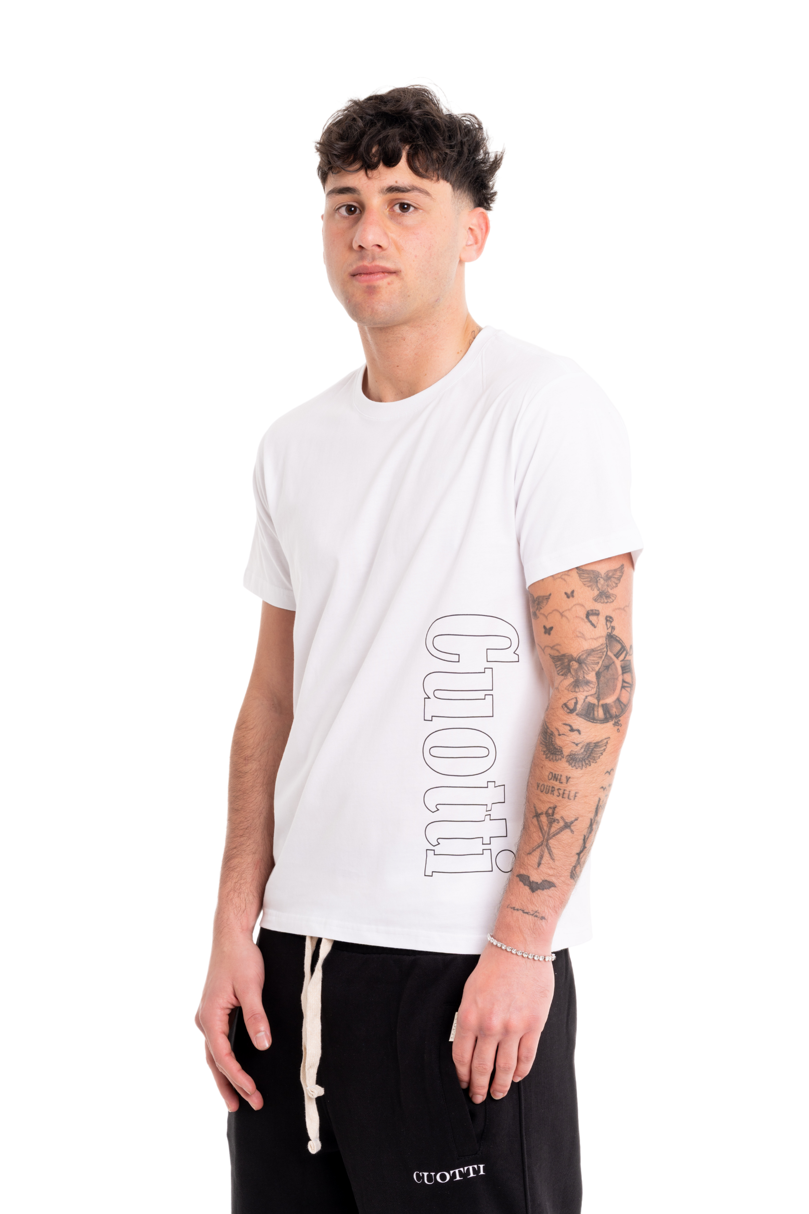 La camiseta blanca con el logotipo CUOTTI en el costado combina el lujo contemporáneo con un diseño innovador. Hecha en algodón premium, su estampado lateral añade un toque distintivo que realza cualquier outfit.
