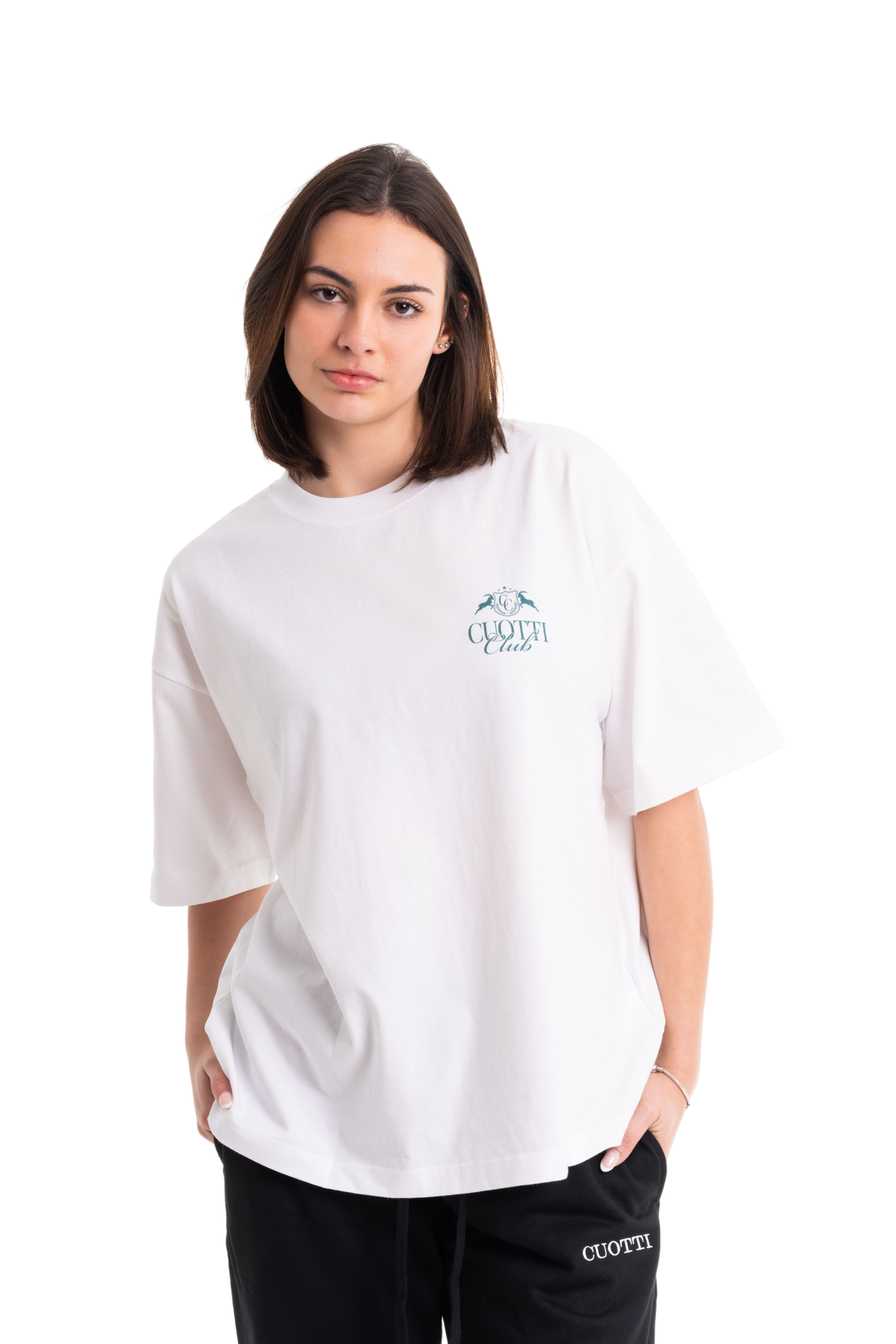 La camiseta blanca CUOTTI CLUB es la esencia del lujo discreto. Confeccionada en algodón premium, ofrece comodidad y estilo con el logotipo CUOTTI CLUB, una invitación al mundo de la moda exclusiva.