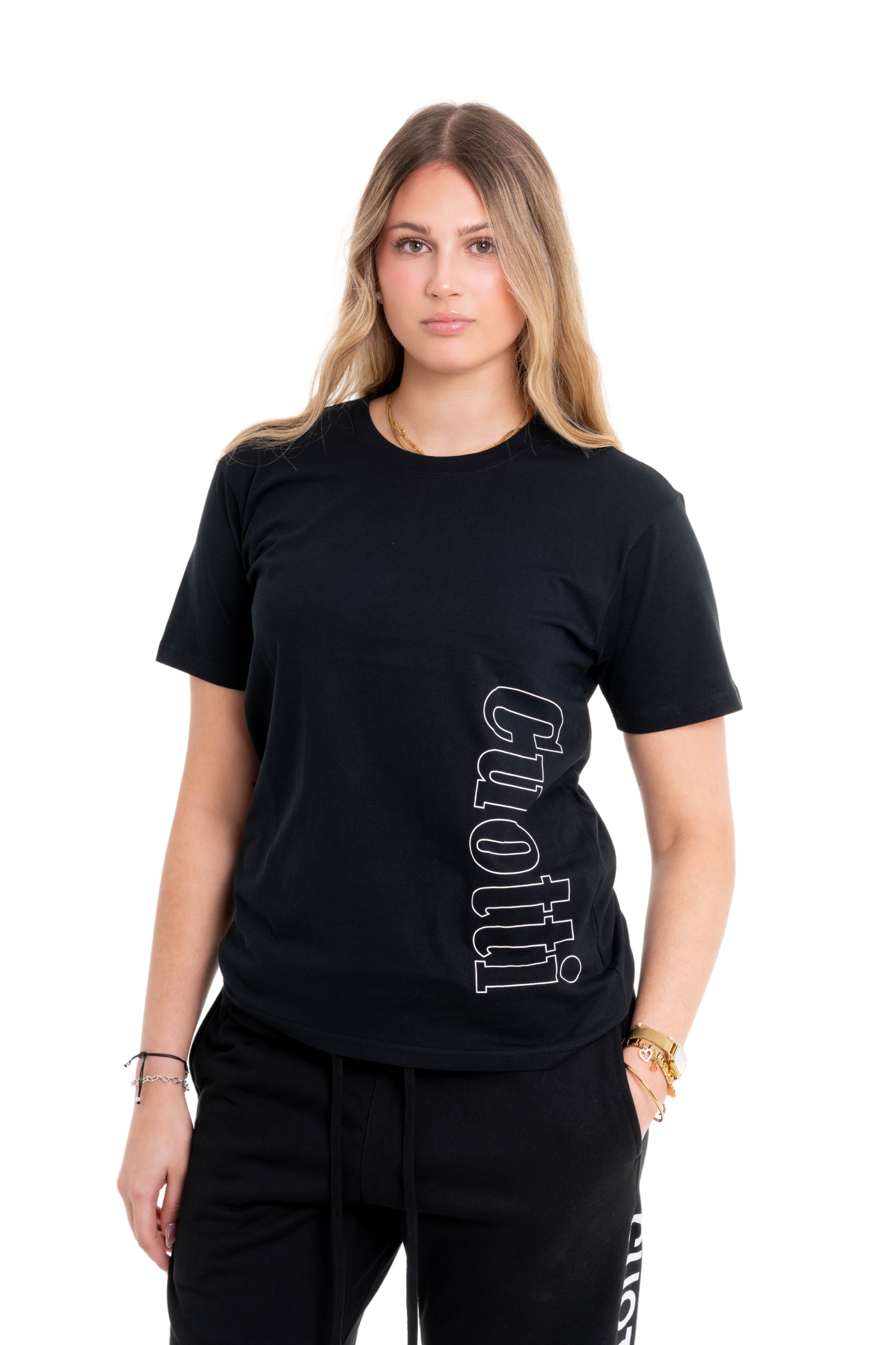 La camiseta negra con el logotipo CUOTTI en el costado combina el lujo contemporáneo con un diseño innovador. Hecha en algodón premium, su estampado lateral añade un toque distintivo que realza cualquier outfit.