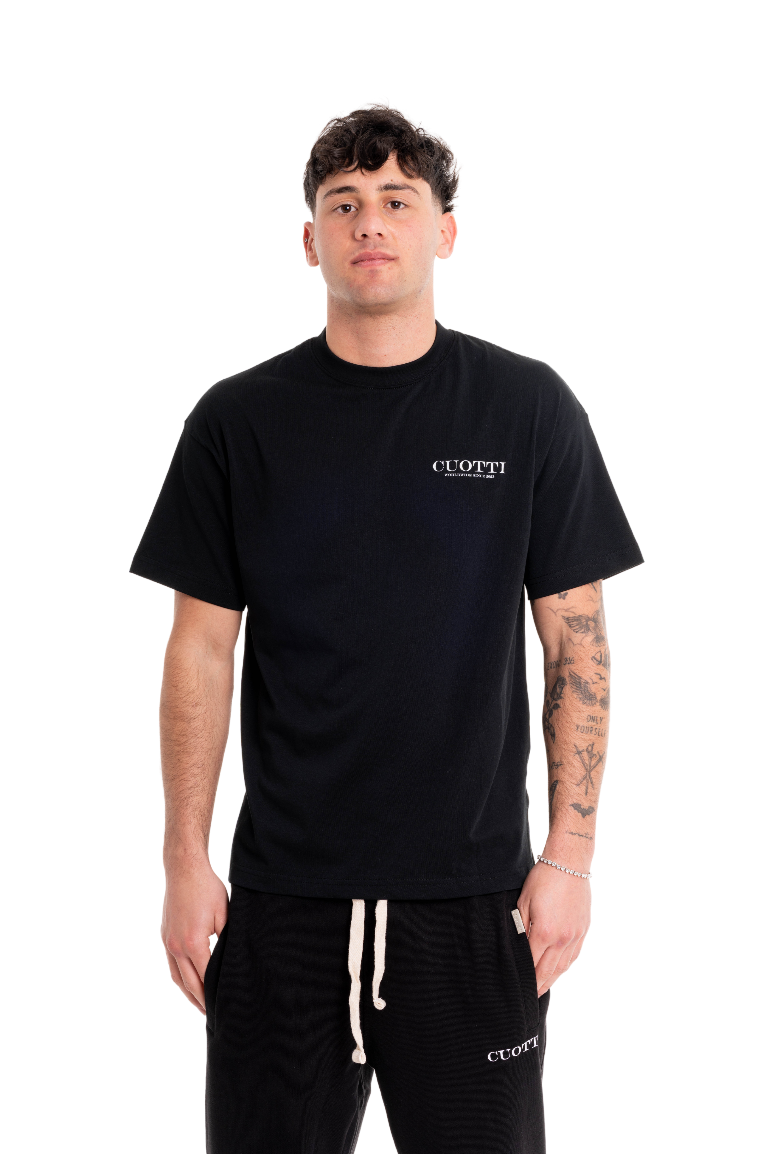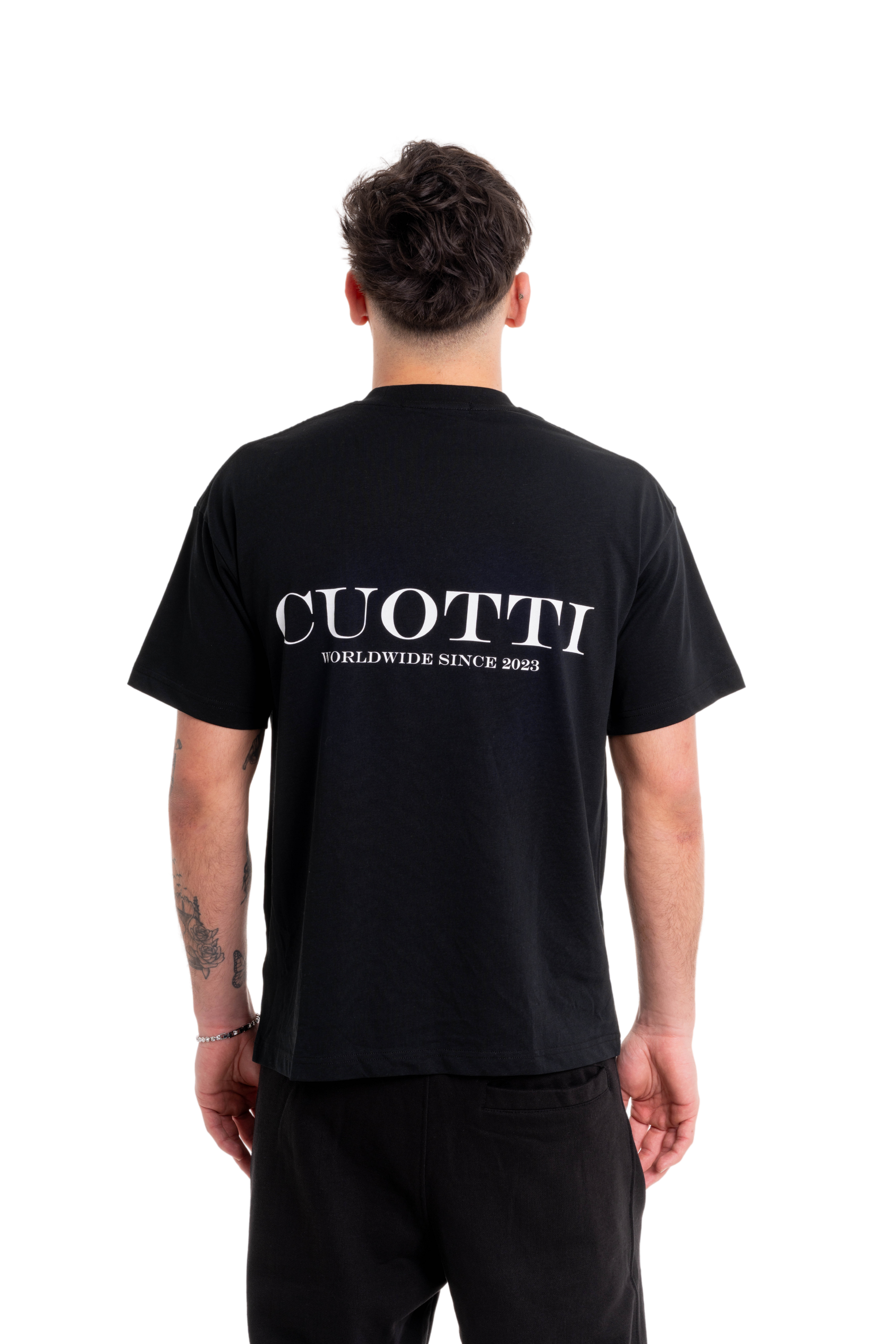 La camiseta negra CUOTTI Worldwide Since combina el lujo español con el espíritu streetwear global. Confeccionada en algodón premium, su diseño exclusivo y su corte cómodo la convierten en un básico de alto nivel. Eleva tu estilo con una prenda pensada para quienes marcan la diferencia. Stock limitado.